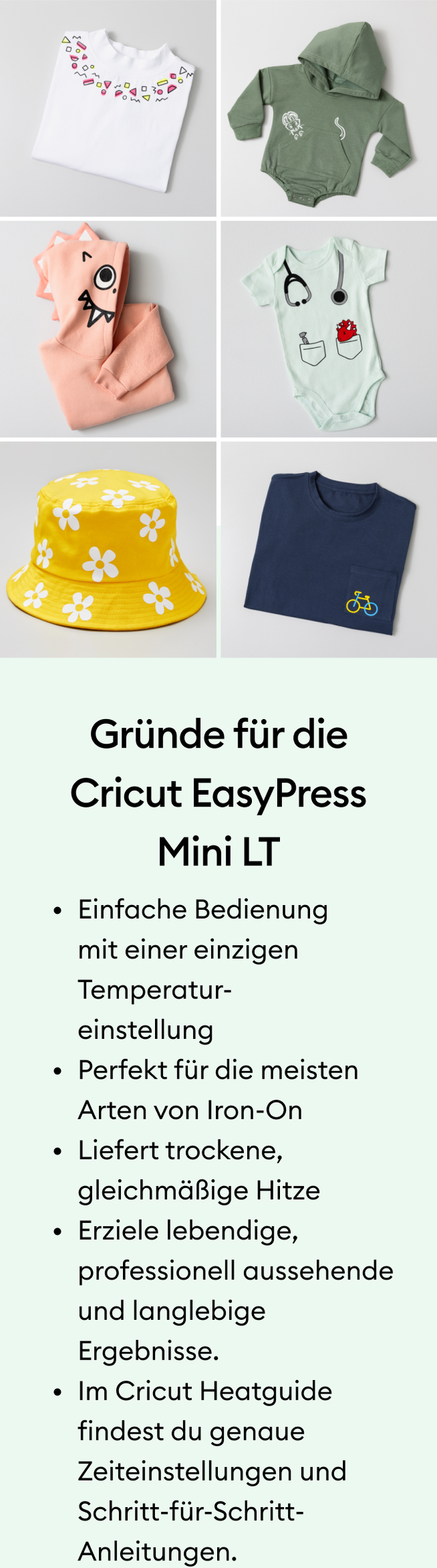Unsere kompakte, einfach zu bedienende, tragbare Heizpresse mit einer einzigen Einstellung – ideal für beliebte Iron-On-Projekte wie T-Shirts, Babykleidung und mehr.